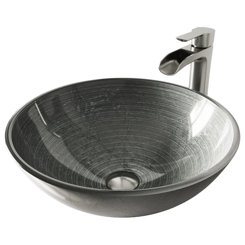 - The VG07053 Simply Silver Glass Vessel Sink features a circular pattern of metallic silver tones.