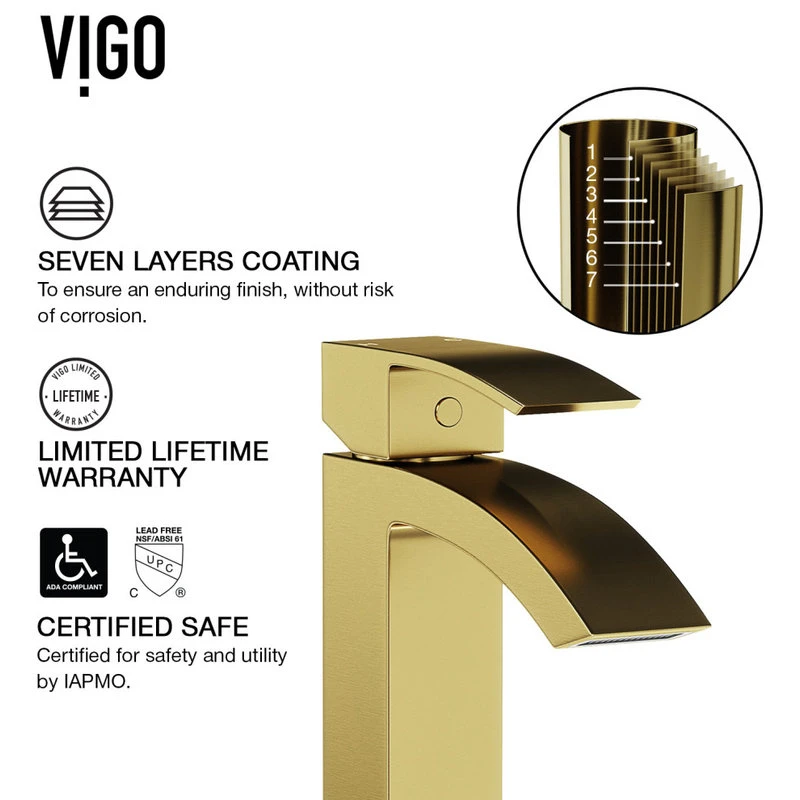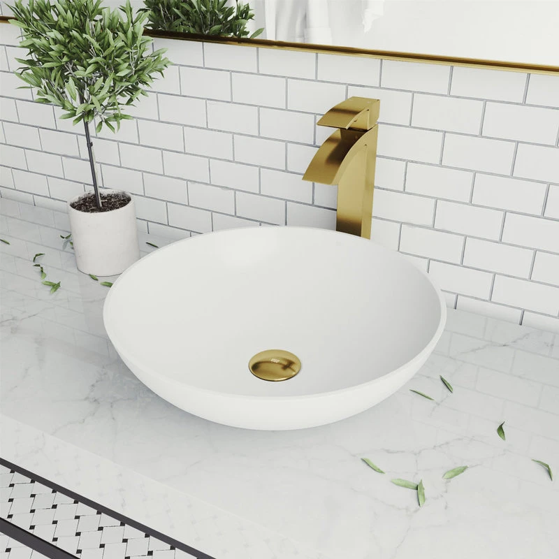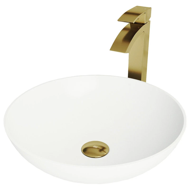 Built from premium materials and designed for artistic excellence, the VIGO Lotus Matte Stone sink with the VIGO Duris Vessel Bathroom Faucet Set in matte brushed gold is modernity at its finest. The sink is made from VIGO’s proprietary Matte Stone construction, a solid to the core, non-porous composite material that resists scratches, stains, and impact. Impressive in build and made to last for years of use, this sink is impeccable in both style and structure. making it just what you need to pair with a sleek faucet like the VIGO Duris Single-Handle Vessel Mount. This faucet has 100% solid brass construction, making it the epitome of strength and resilience. Its vessel mount installation frees up counterspace to offer a more spacious layout. The faucet’s water volume and temperature operations are controlled by the use of just one, easy to use lever. With a 1.2 gpm flow rate, the VIGO Duris conserves water without compromising performance. Practical and stylish, this faucet does it all. The bathroom sink set comes complete with a matching matte brushed gold pop-up drain and mounting ring for your convenience.