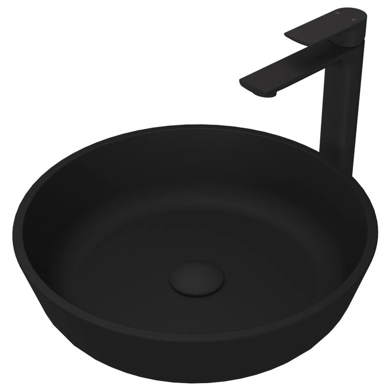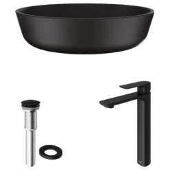 VIGO Vessel sink sets bring state-of-the-art components and style to your modern bathroom of today. Deliberately designed, the VIGO Black Modus MatteShell Bathroom Sink Set is innovative and intense. MatteShell sinks bring the same excellence of classic solid tempered glass and take the construction to the next level. The Black Modus is deeply opaque and has an eggshell-like sheen that is rich yet subtle. Its deep ebony shade is infused into the sink itself, eliminating the risk of a chipped finish. It has a unique coating to prevent fingerprints and marks, leaving it pristine for years of use. This sink has a modern, round shape that brings modernity into any bathroom. It is paired with the VIGO Norfolk, single-hole, vessel mount bathroom faucet. This easy-to-use faucet is tall without overpowering your space. It has exceptional hardware and is outfitted in a contemporary matte black finish that resists rust, corrosion and tarnish. The set is made complete with a matching pop-up drain without overflow. Experience the synergy of character and style with this all-in-one bathroom set.