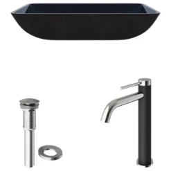 Constructed from solid tempered glass, the VIGO Rectangular Turquoise Water Glass Vessel Bathroom Sink and VIGO Lexington Single Hole cFiber Vessel Bathroom Faucet in Brushed Nickel Set is a modern addition to your home. The rich blue polished interior and solid black textured exterior of the sink makes it stain-resistant and easy to maintain. It has a clean yet softened rectangular shape that makes installation on countertops easy. Paired with the sink is the VIGO Lexington Single Hole cFiber Vessel Bathroom Faucet. Expertly made from solid brass and featuring a carbon fiber shell, this faucet is the epitome of strength and resilience. Along with a matching pop-up drain coated in a premium 7-layer plated finish, this set will complete your contemporary bathroom.