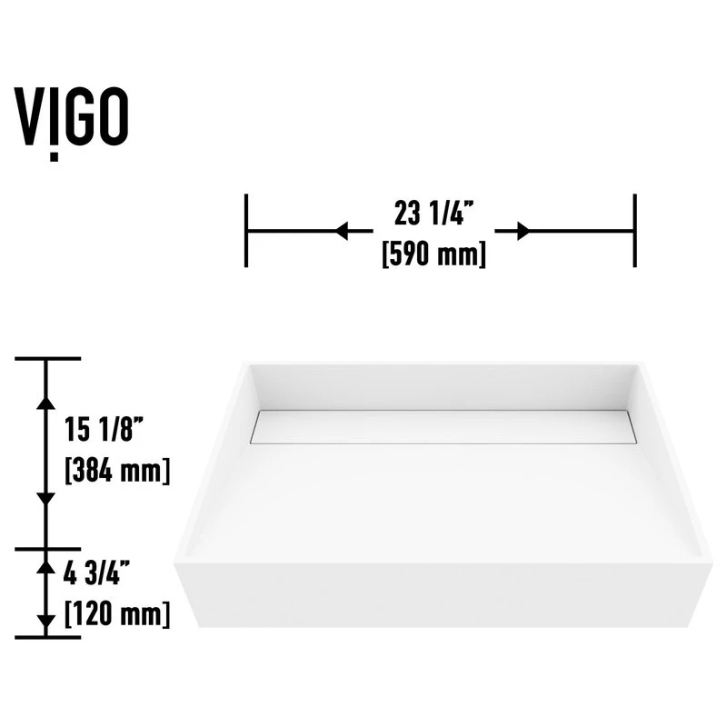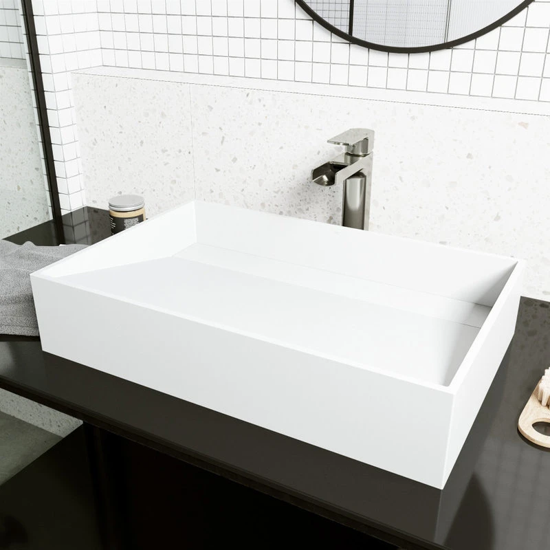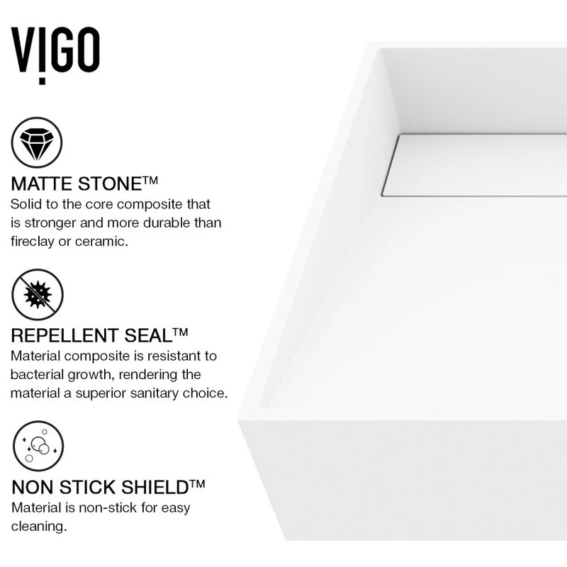 A rectangular design shape and exclusive stone material distinguish The Starr by VIGO. Constructed from VIGO’s exclusive Matte StoneTM material, this vessel bathroom sink is solid-to-the-core, more robust, and more durable than conventional vessel sink materials like fireclay or ceramic that chip and crack. Its unique stone material delivers a clean white color and a smooth-to-touch surface. Its drain plate elegantly hides the drain and provides a flawless cleaning experience. The Starr matches innovation with style to create a highly functional art fixture for your bathroom.