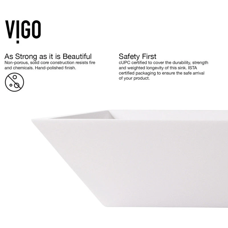 SOLID CORE COMPOSITE: VIGO’s signature non-porous Matte Stone is a PMMA composite solid surface designed for durability. The surface is stain/crack-resistant and hand-polished inside and outside upon production