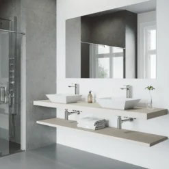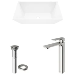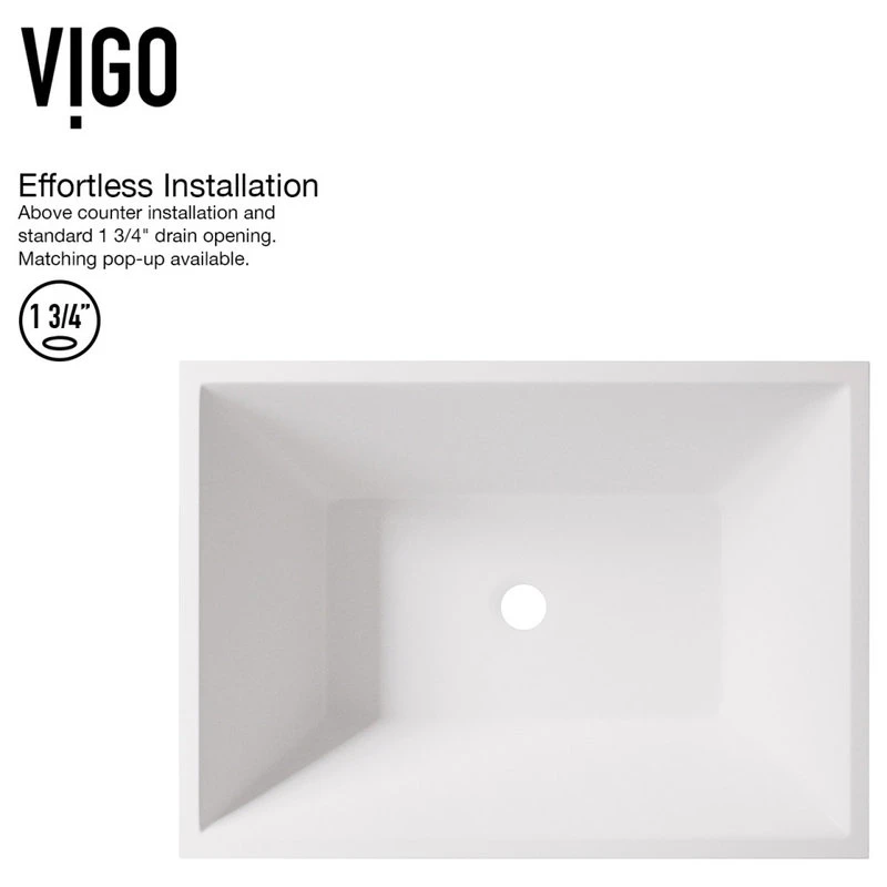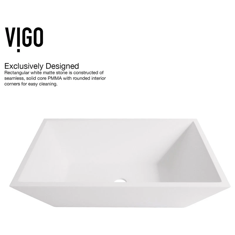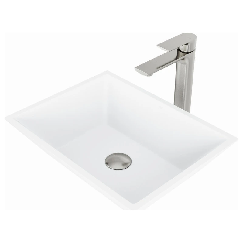 The durable rectangular Vinca Matte Stone Vessel Bathroom Sink is a sharp statement piece and an excellent choice for providing a modern bathroom with symmetry. The sink’s satiny-smooth hand-polished white Matte Stone surface resists stains, scratches, and chipping, seamlessly keeping it looking new for years to come, while easy DIY countertop installation can transform a vanity with bold dimension. Pair with a matching pop-up drain and spa-inspired single-lever faucet to lend sophistication to any modern bathroom, large or small.