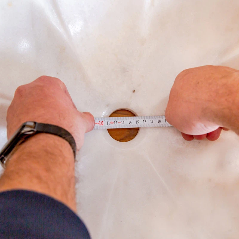Hand carved natural marble construction. Diameter is 17 inches, Height is 6 inches, Drain hole 1.5 inches. Its curved edges and smooth construction facilitate the cleaning and maintenance of this sink bowl. Not easy to produce cracks, refused to dirt deposition, durable and not deformed. No overflow and very resistant to drains.