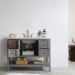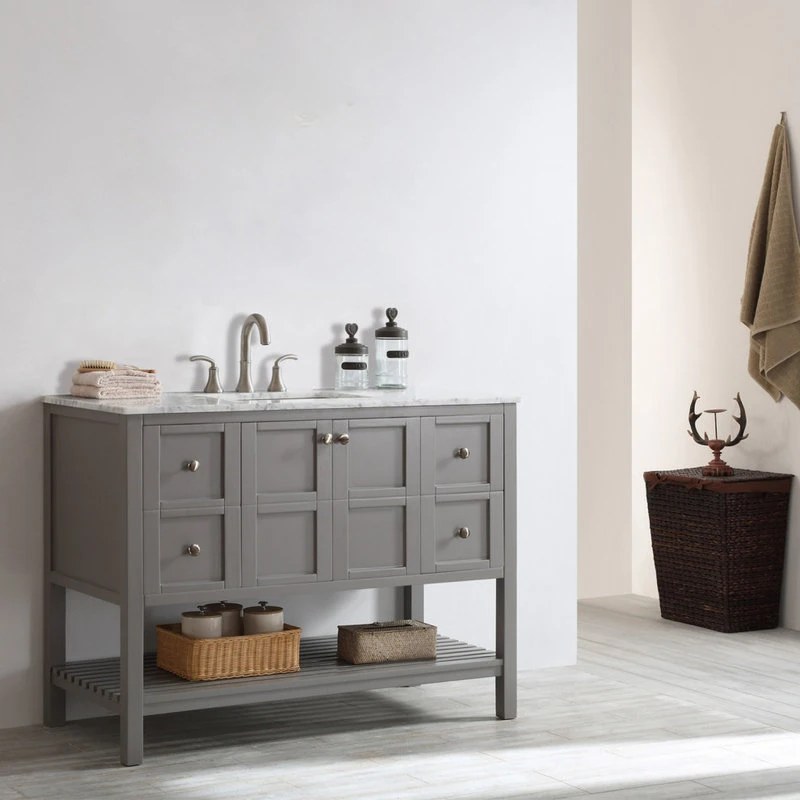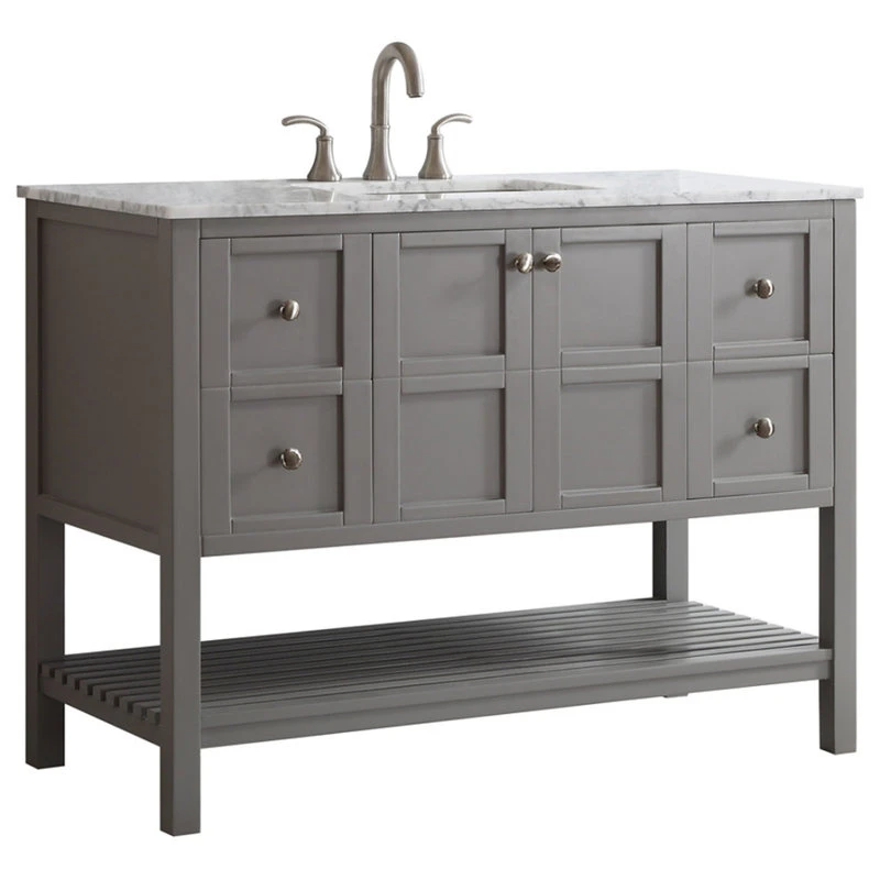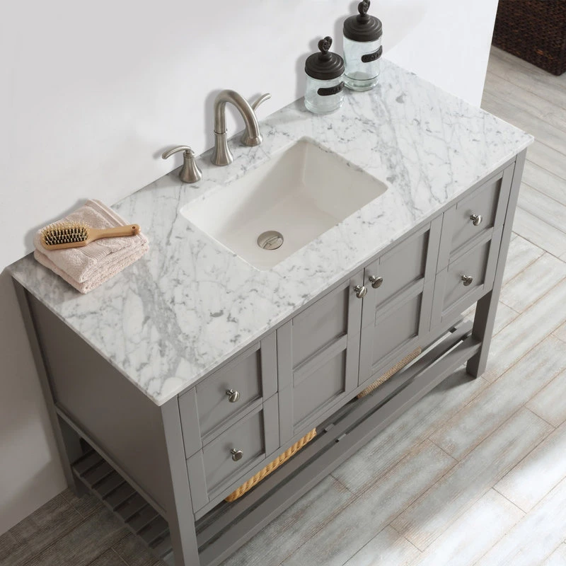 Retire your vanity and revamp your bathroom with the Florence Single Vanity. White Carrara marble, grid-patterned drawers and satin nickel knobs anchor this piece in sophisticated, traditional style. With oak construction and clean lines, the Florence offers an elegant workstation and centerpiece.