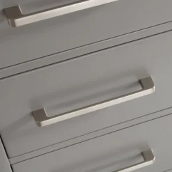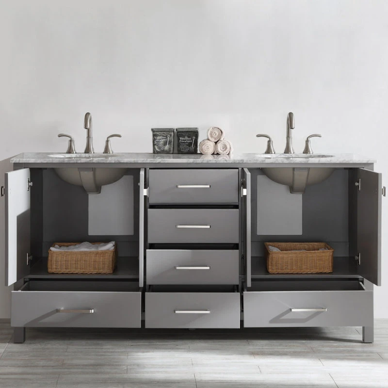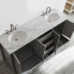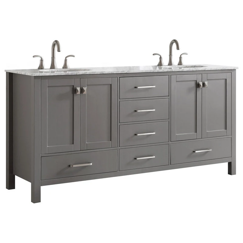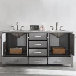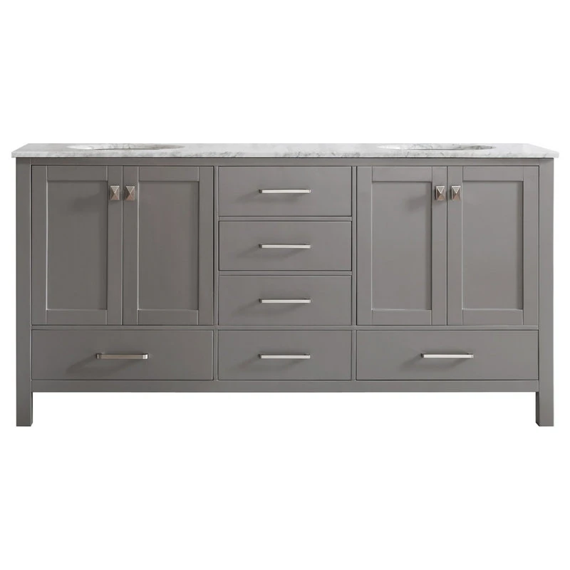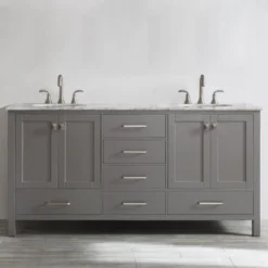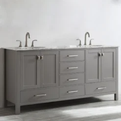 Tie your bathroom scheme together with the gray Gela Vanity Without Mirror. Its clean lines, satin nickel hardware and contrasting white countertop revamp your space with classic flair. Reimagine your design with the Gela for crisp transitional style.