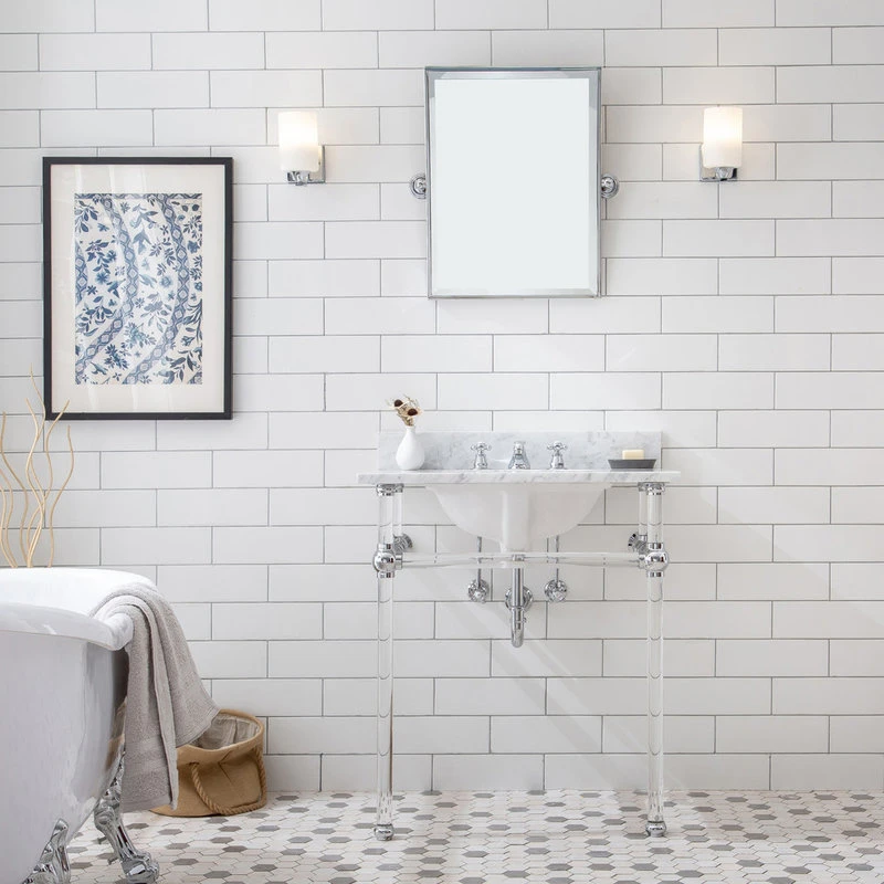 The Empire collection wash stand enhances contemporary beautification into a sophisticated bathroom. It was inspired to perfect the elegant designs on your bathroom. Copper joints and acrylic stand melding for a cohesive whole, this carrara white marble wash stand sink with crystal clear acrylic stand is a perfect match your bathroom. An accessible bar across the front of deluxe, substantial acrylic legs not only improves stability but also is perfect to rest towels and toiletries. The timelessness of the artful design reigns the royalty vibe of your bathroom.