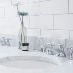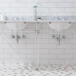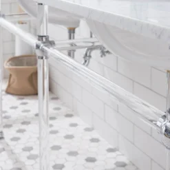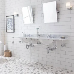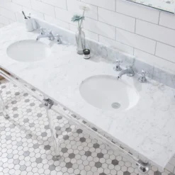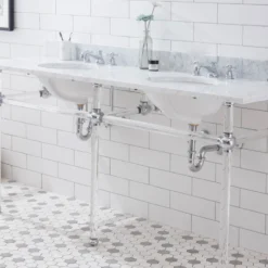 - A classically inspired washbasin console, Empire Collection, enhances contemporary beautification into a sophisticated bathroom. Copper joints and acrylic stand melding for a cohesive whole, this Carrara white marble console with crystal clear acrylic stand and smooth white ceramic sink is a perfect match for a miniature bathroom. An accessible bar across the front of deluxe, substantial acrylic legs not only improves stability but also provides a location from which is perfect for hanging towels and toiletries. Suitable for applications both contemporary and traditional, this artful design retains the harmony between proportions and its timeless charisma.
