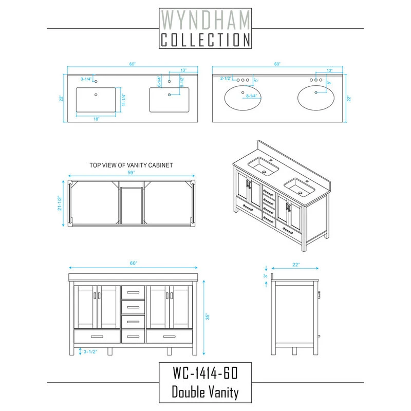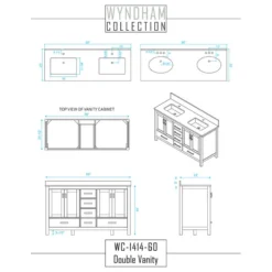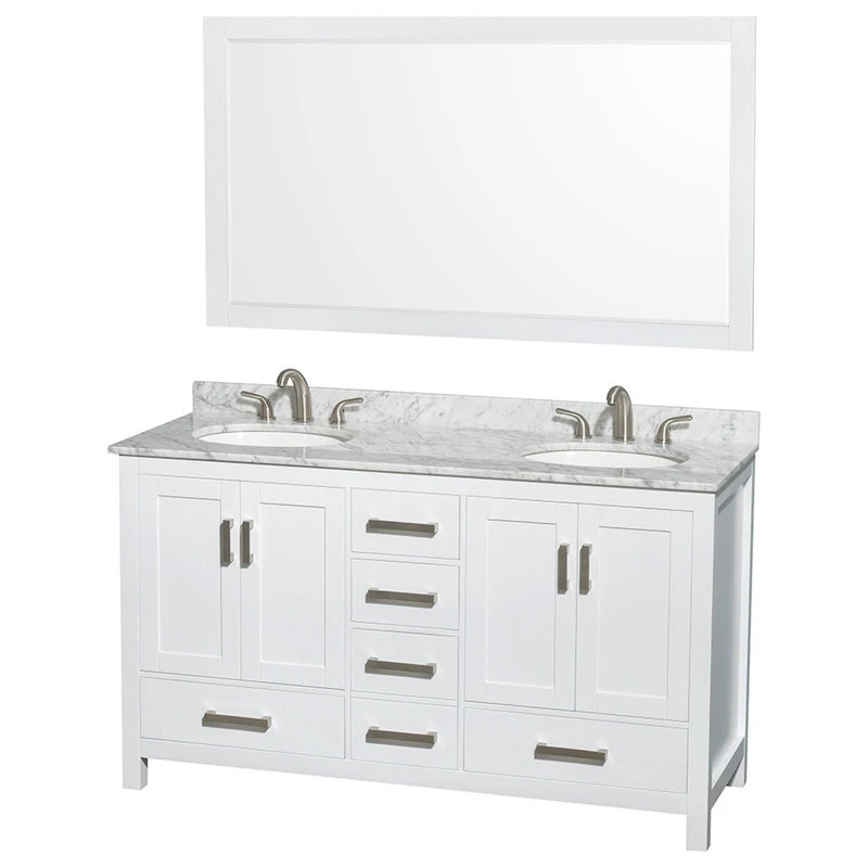 - 58 inch Matching Mirror Included. Undermount Oval Porcelain Sinks. 8″ widespread 3-hole faucet mount. Plenty of counter space