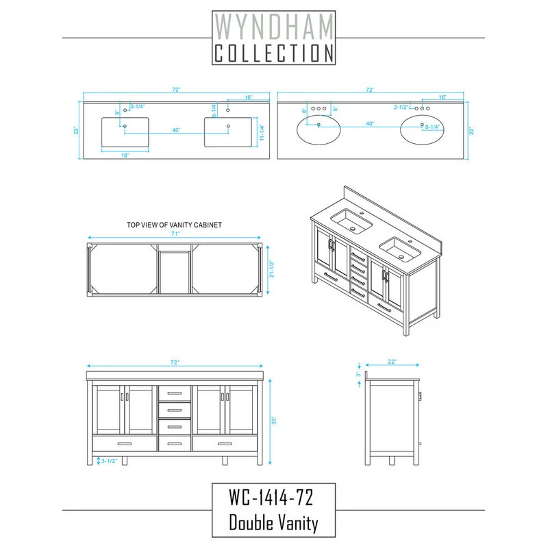 Counter includes 3″ backsplash. Available with Porcelain undermount sink(s). Oval sink(s) available with pre-drilled 8″ Widespread 3-Hole faucet mounts. Faucet(s) not included. Metal exterior hardware with brushed chrome finish.